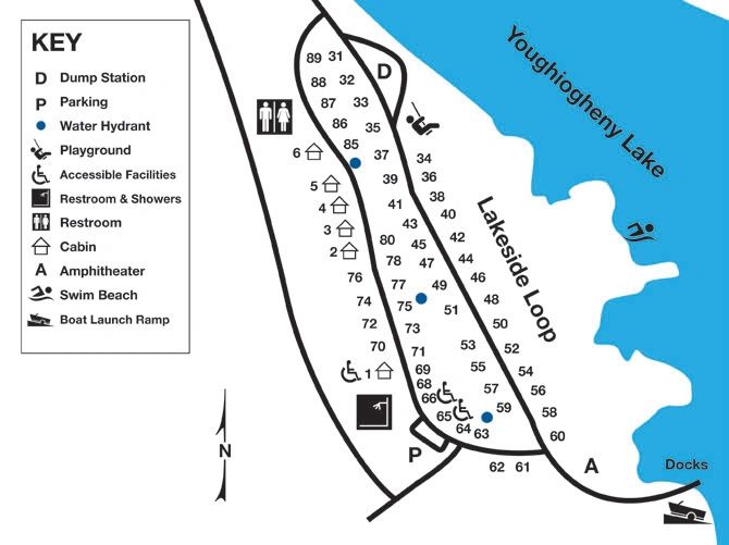 Each Lakeside campsite is complete with a picnic table and fire ring with grill setup. The sites are situated directly on the Youghiogheny River Lake. The playground, swim beach, and dump station are all located on the Lakeside Loop. Sites range in length from 40-55 feet, allowing for a variety of campers and RVs. There is a two tent or one camper and one tent limit per site.